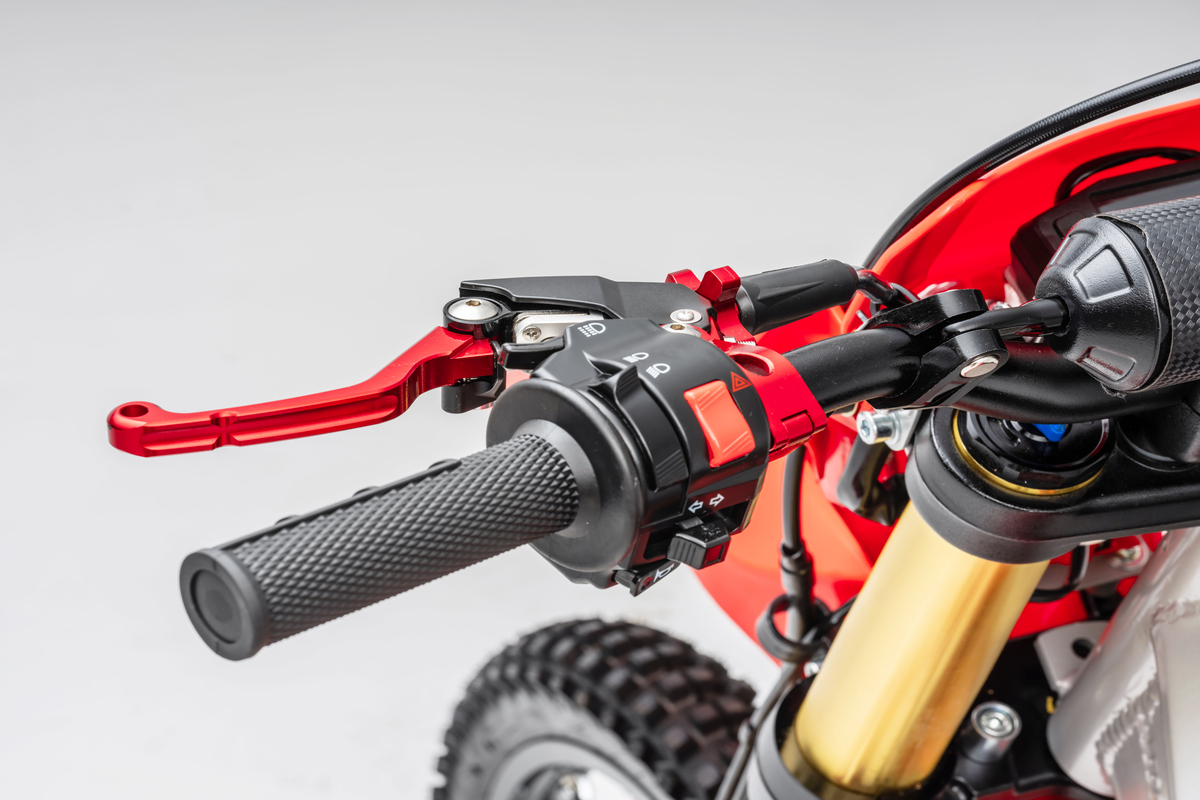 Palanca de freno y embrague: Regulables y totalmente rebatibles para evitar su rotura ante caídas, asegurando la continuidad en la práctica o competencia.